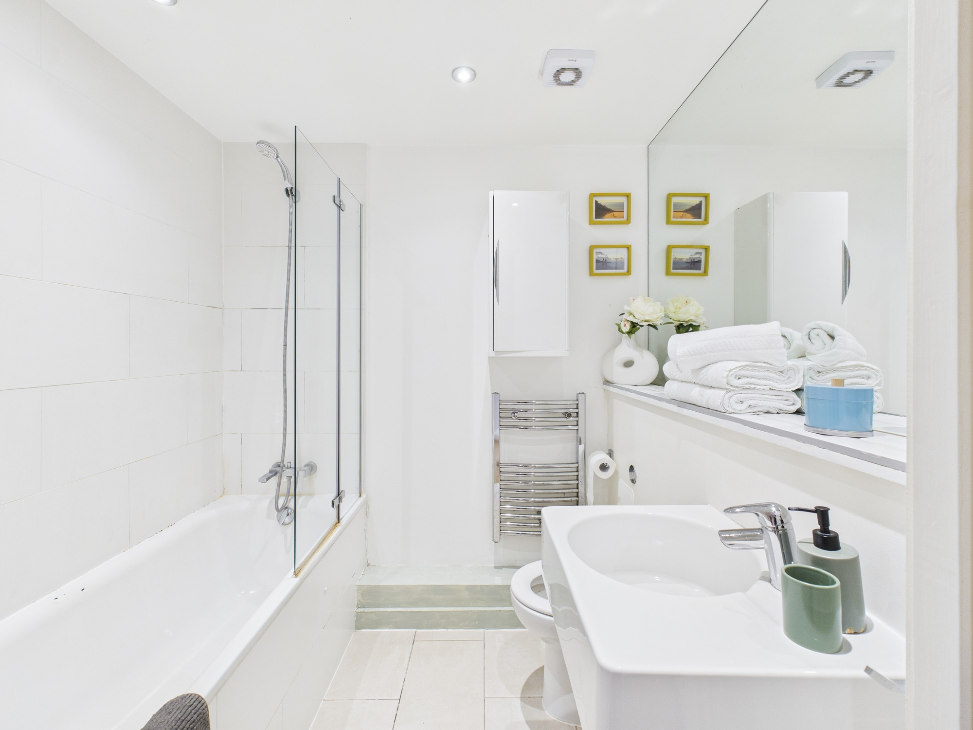 The bedroom offers a peaceful retreat with a comfortable double bed, generous storage, and soft, homely touches that create a restful atmosphere. The contemporary bathroom features a full-size bath with shower, fresh fluffy towels, and essential toiletries — ideal for unwinding after a busy day.