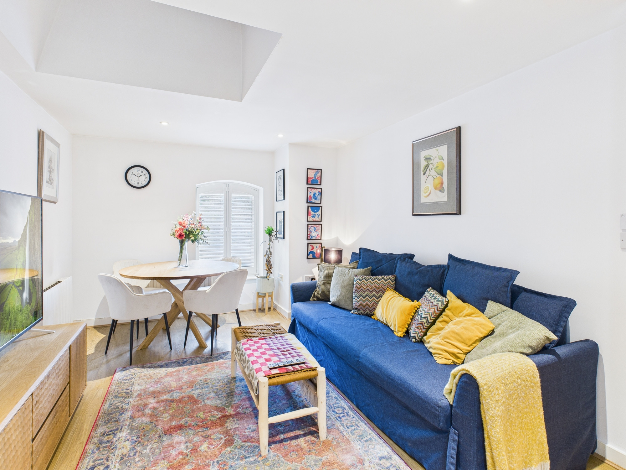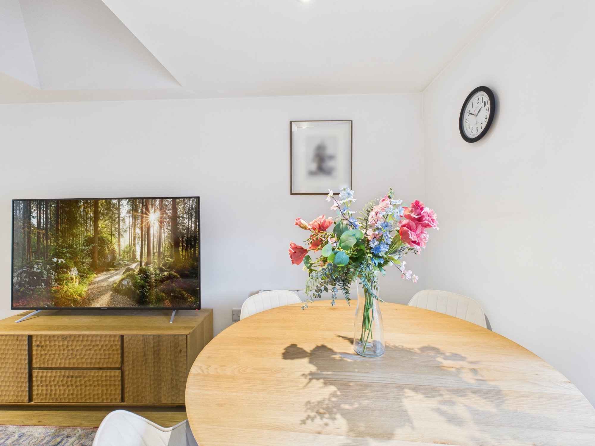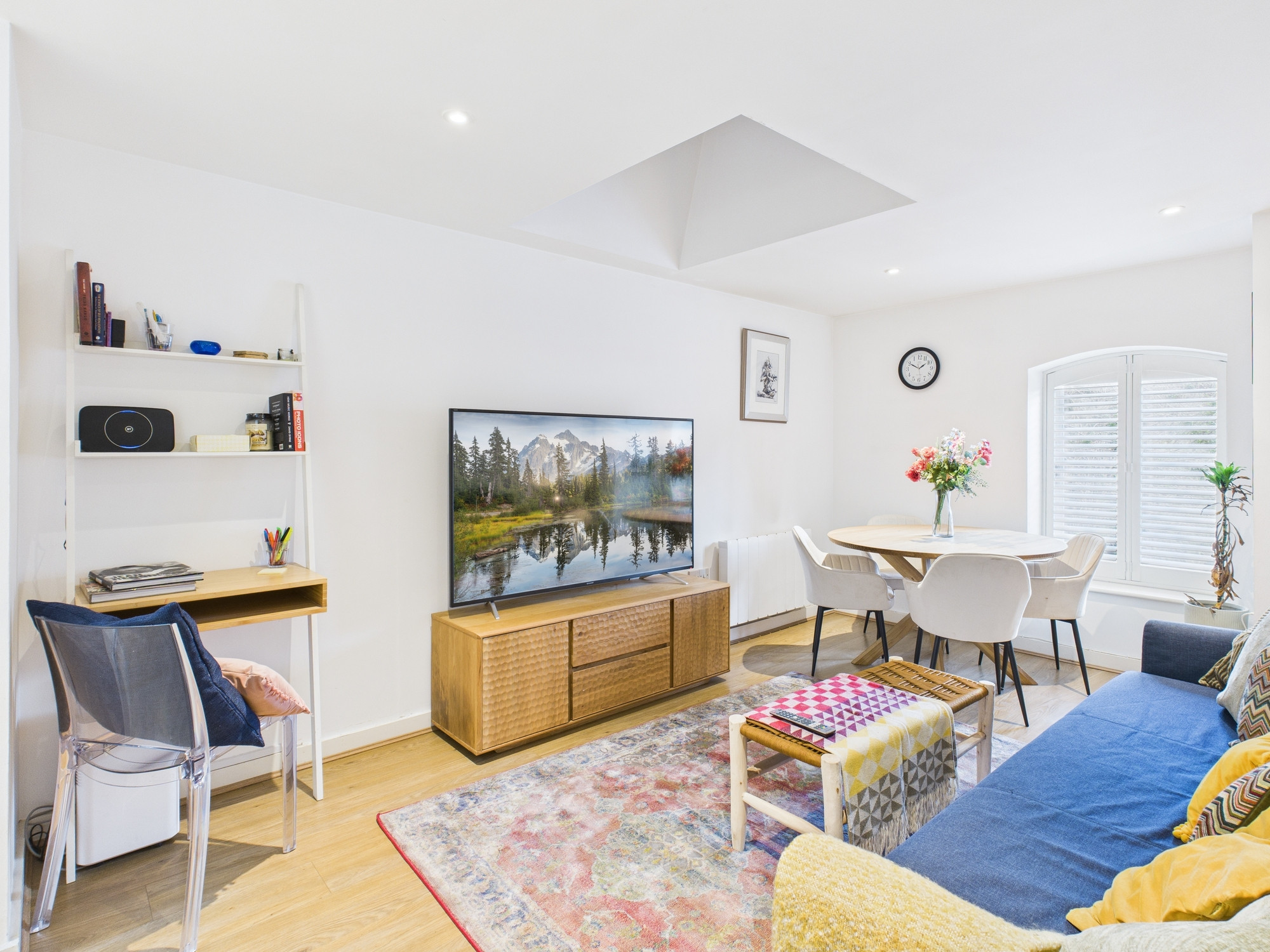 The open-plan living space is light and airy, featuring a comfortable sofa (which converts into a double sofa bed), a large smart TV with streaming access, and a dedicated dining area — perfect for relaxed evenings in or sharing a meal after a day exploring the city.